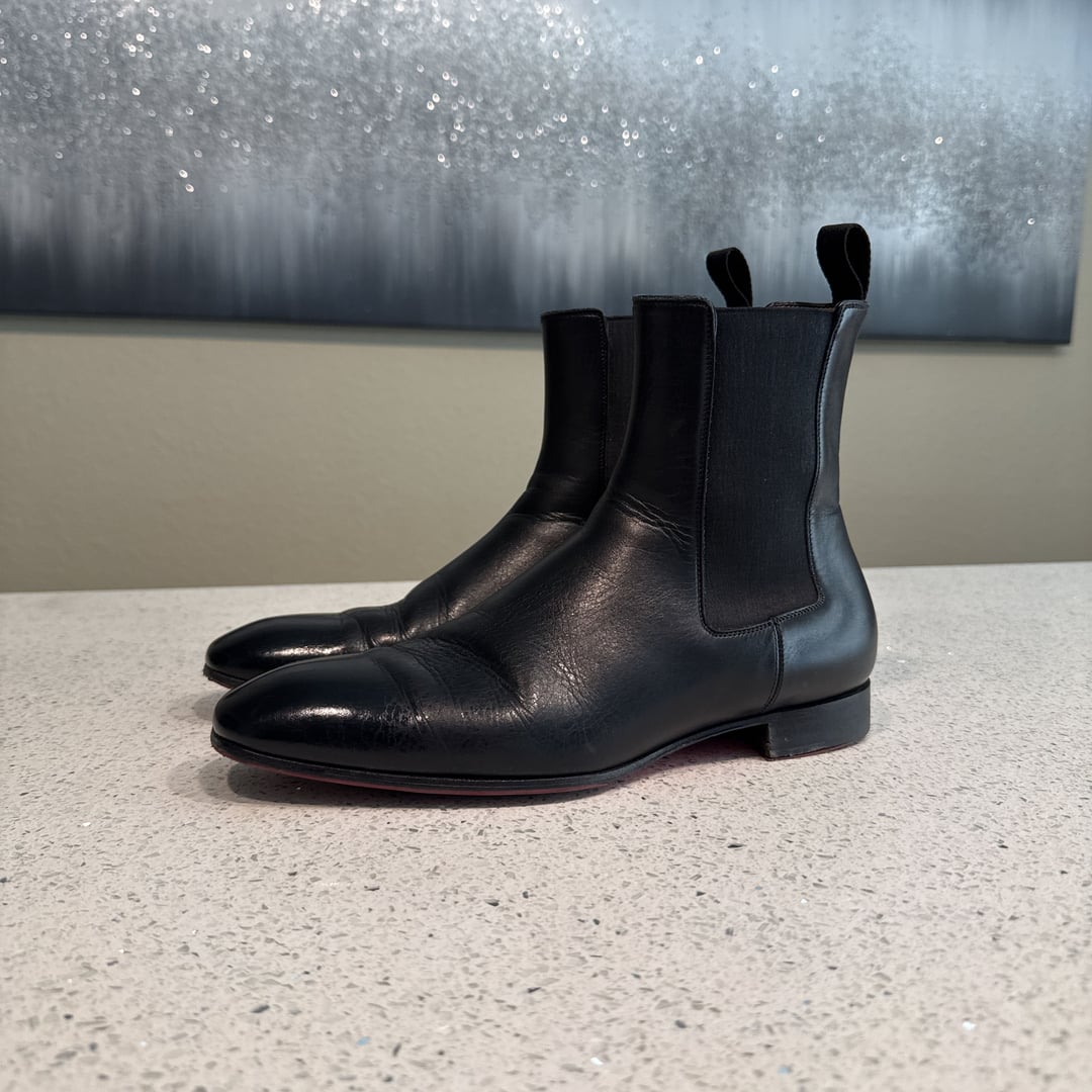 These elegant Chelsea boots offer a refined look with their sleek black leather finish. Designed by Christian Louboutin, they feature signature craftsmanship and sophisticated style, making them a perfect addition to any wardrobe. Men size 6.5/ woman 8